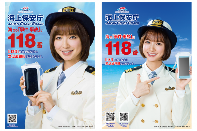 7月23日は海の日。今年は新型コロナウイルスの影響で海水浴場が開設されないところもありますが、海には危険がつきものです。そんな海の安全を守る海上保安庁では、万が一の時の緊急連絡先「118番」の周知に努めています。110番や119番と並ぶ認知度のアップを目指したポスター、実は今年のものは去年版とひと味違います。イメージモデルを務める篠田麻里子さんも「最初はわからなかった」と言う一方、篠田さんの父親はすぐに気がついたそうです。その違い、みなさんは分かりますか? (朝日新聞記者・吉田貴司) 【写真】篠田麻里子さんも気がつかなかった、今年のポスターの「ある変化」 拡大して制服をよく見ると……