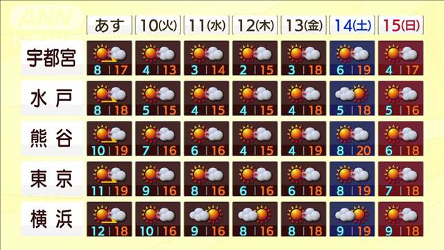 一方、北部の峠道では雪で積もる所もありそうです。この先は、晴れる日が多いです。北風が吹いて空気の乾燥が進みそうです。寒さの底は12日で、宇都宮では2度まで下がりそうです。日中もこの時期らしい気温で、東京は15度から20度、秋物コートが活躍しそうです。