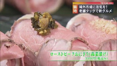 そこで提供されるのが新たな“街の名物”を目指した、自慢のローストビーフを酢飯に包んだ「特製おにぎり」です。3代目の寺出昌広社長は漬物店や乾物店など築地場外にある老舗に声を掛け、各店舗の自慢の逸品とローストビーフのおにぎりを組み合わせた新たなメニューを開発しています。さまざまな築地場外の店舗との協力で生み出されていく「ローストビーフおにぎり」は、現在10店舗との連携が実現しています。寺出さんは「いろいろな店とコラボして、最終的には460店舗全ての味がそろうような形でこれから築地を盛り上げていきたい。ぜひ来てほしい」と話しています。