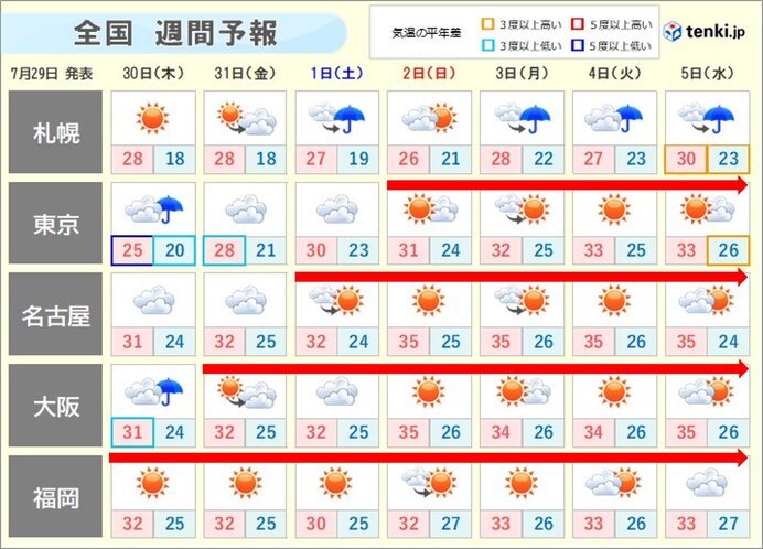 あす30日(木)は西日本付近は太平洋高気圧に覆われて、梅雨前線は日本海まで北上する見込みです。あさって(金)以降は西日本付近で太平洋高気圧の勢力が少しずつ強まって、今週中に梅雨明けする所が多いでしょう。一方、東日本や東北は湿った空気の影響で、7月中はまだ梅雨空が続きそうです。