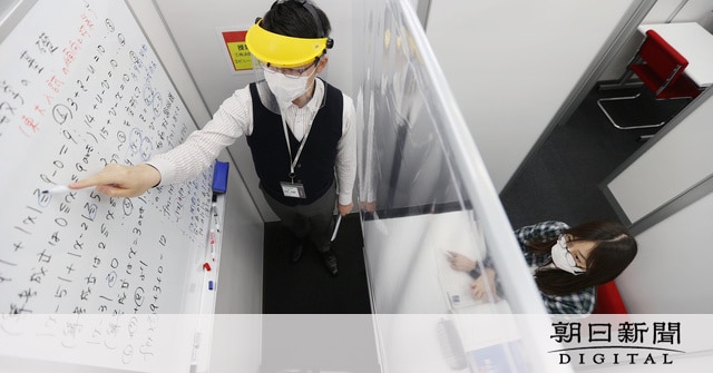 東京都豊島区の池袋校では、それぞれの個室の広さは1・9×1・2メートル。講師と生徒との間に飛沫(ひまつ)感染を防ぐ透明のシートを設置した上で、講師はマスクにフェースガードを着用し、生徒もマスクを着ける。個室は1区画ごと周囲を空けて授業に使っている。