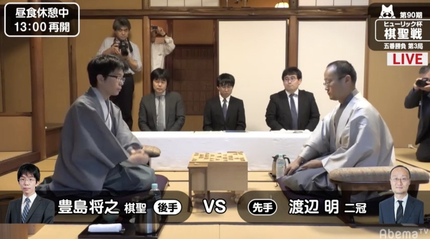 豊島将之棋聖 2時間36分(消費1時間24分) 渡辺明二冠 2時間54分(消費1時間6分)