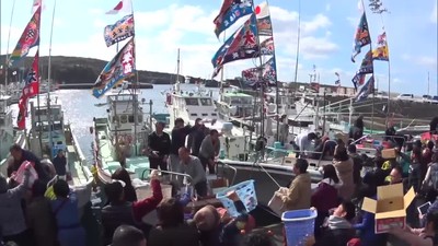漁船から勢いよくまかれるミカン。これは船主たちが、新年の豊漁と安全を船に宿るとされる守護神「船霊様」に祈願する「船祝い」です。阿古漁港など2カ所で行われました。