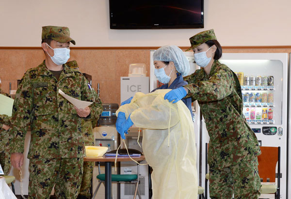防護服の着脱訓練もあり、参加者は着る手順や、ウイルスが体に付着しない脱ぎ方などを自衛隊員に教わった。訓練を受けた女性保健師(50)は「これから頑張っていかなければと改めて気を引き締めた」と話した。(白波宏野)