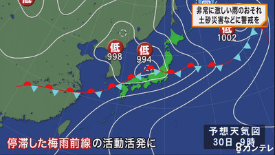 そのため、30日昼過ぎから7月1日にかけて局地的に雷を伴った非常に激しい雨が降り、大雨になるおそれがあります。