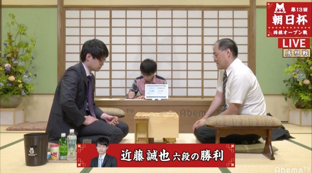 高勝率を誇る近藤六段は、角換わり腰掛け銀の戦型から、安定した指し回しでリード。アマの強豪相手に、持ち時間40分の早指しながら6分余す快勝だった。