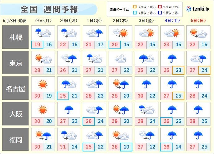 梅雨最盛期。この先、九州から関東で大雨の恐れがあり、九州では警報級の大雨の可能性があります。30日(火)から7月1日(木)は、広く強風にも注意が必要です。