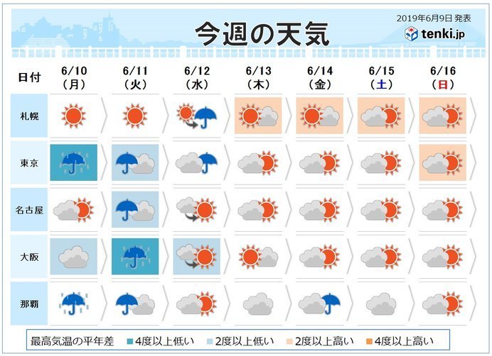 沖縄や奄美は、梅雨前線の影響で11日(火)にかけて大雨の恐れ。九州から東北も、11日(火)から13日(木)は上空の気圧の谷の影響で、局地的に激しい雨。