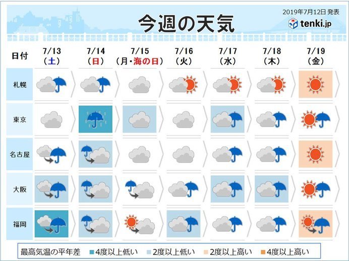 「海の日」にかけての三連休は、広くぐずついた天気。来週いっぱい「曇りや雨」の所が多く、雨脚の強まる日も。沖縄だけは夏空が続きそう。