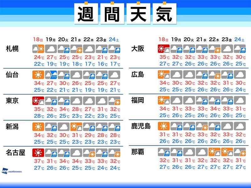 お盆が過ぎたものの、まだ暑い日が続きます。西日本や東日本では最高気温が35℃以上の猛暑日となる所が多い予想です。埼玉や群馬、栃木などでは、40℃近くまで気温が上昇するおそれもあります。