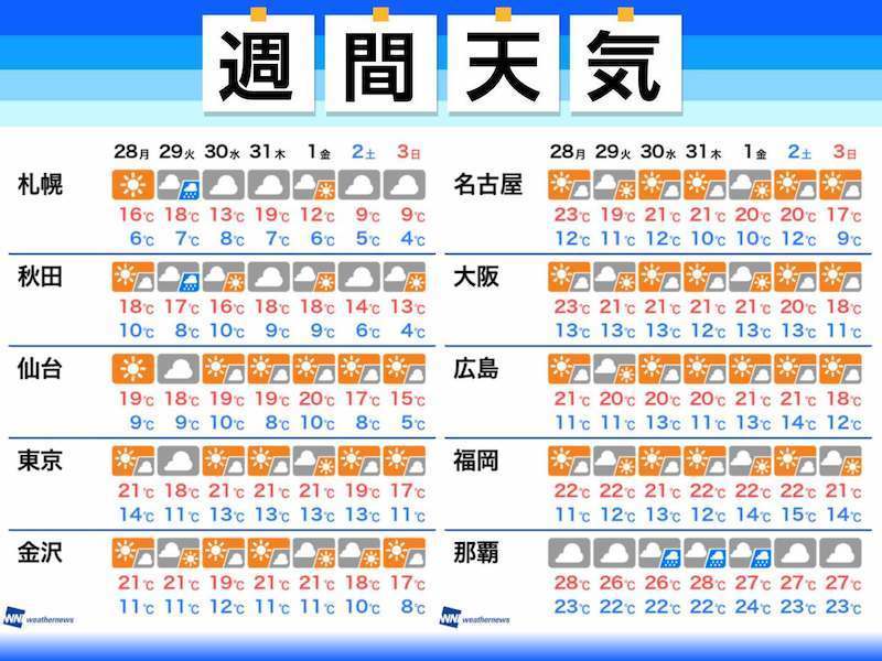 ただ、29日(火)は低気圧の影響で、東日本や西日本の広範囲で曇りや雨などでスッキリしない天気になる可能性がります。週間予報で雨のアイコンがついていなくてもにわか雨の可能性があるので、天気予報をこまめに確認するようにしてください。