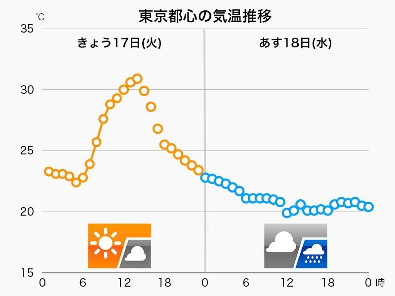 一方、明日の予想最高気温は千葉で21℃、館山で23℃と、今日よりも10℃近く低い最高気温が予想されています。