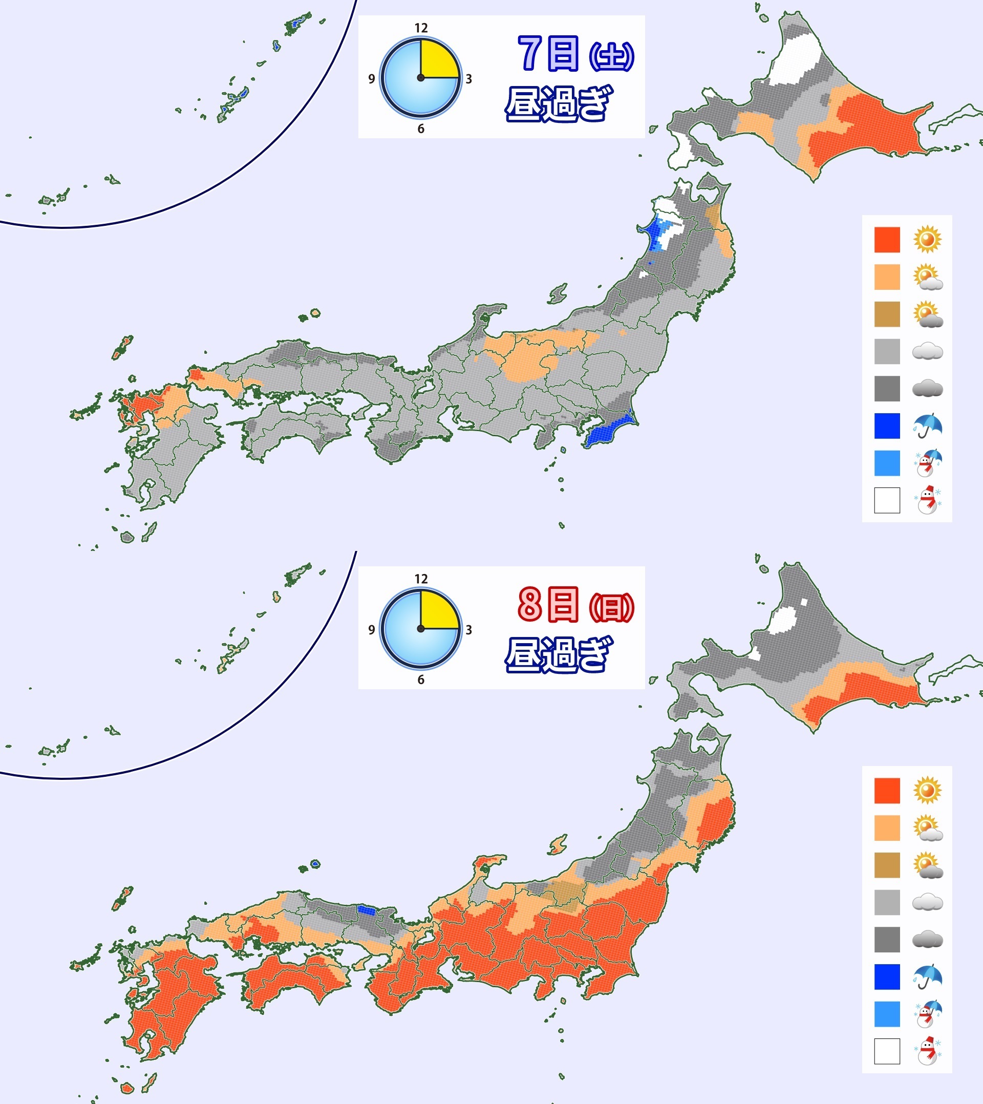 関東~九州では、あす8日(日)は広い範囲で朝から一日を通して安定して晴れそうだ。予想最高気温も14℃前後の所が多く、日中も平年並みの気温となる予想。