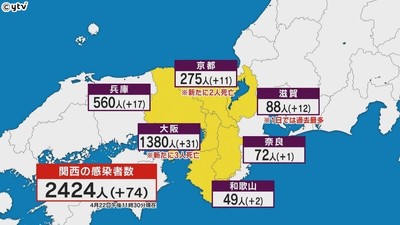 兵庫県では新たに17人の感染が確認され、うち1人が神戸市の中央市民病院に勤める清掃スタッフだった。さらに既に発表されている感染者の中に、市民病院の看護師と理学療法士4人が含まれていることが分かり、病院関係の感染者は31人となった。また、大阪府では新たに31人の感染が確認されたが、この1週間では最も少ない数となった。このほかに、滋賀県ではこれまでで最も多い12人、京都府で11人、和歌山県で2人、奈良県で1人の感染が確認され、京都府では2人が死亡した。関西での感染者は74人増えて