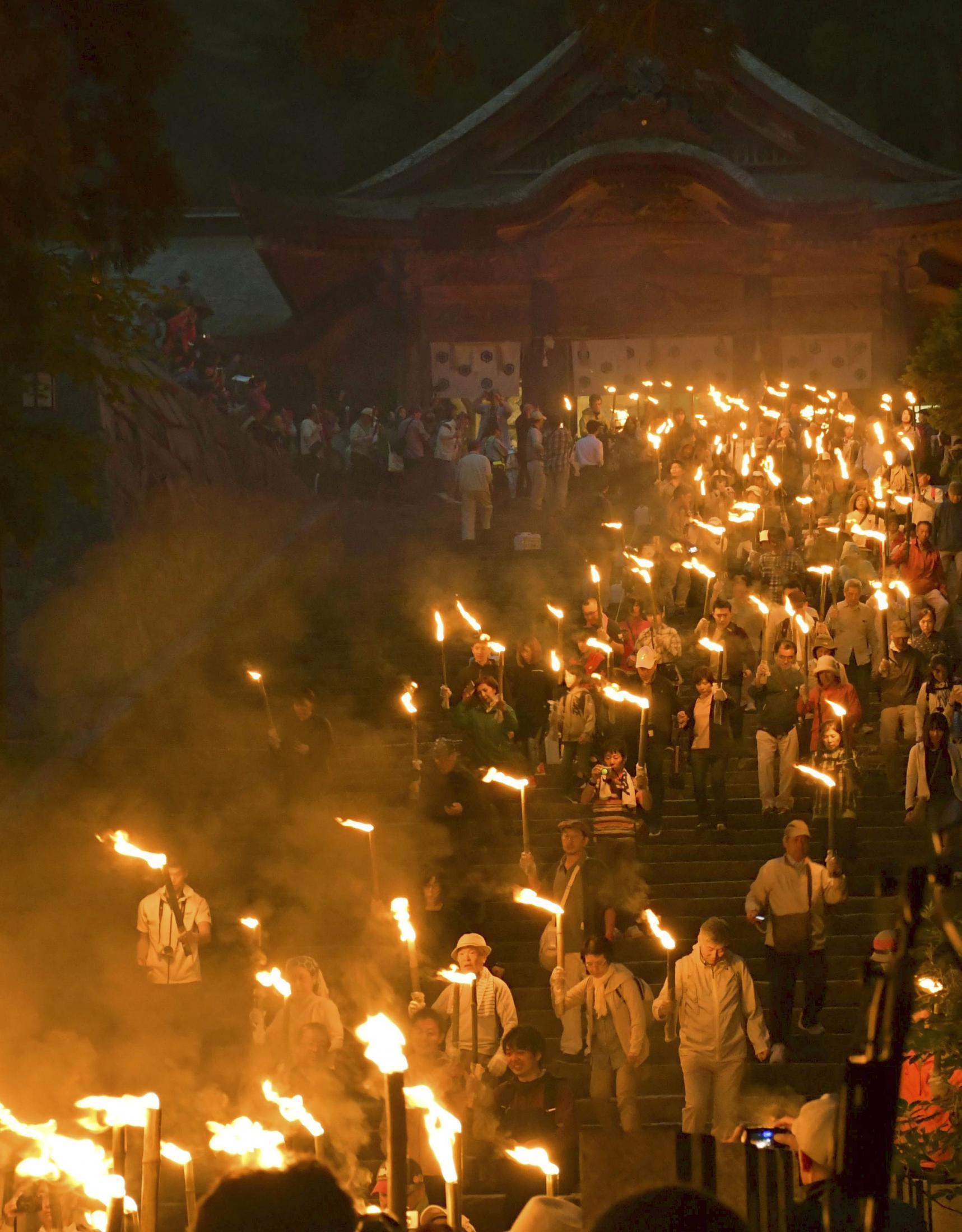 奥宮では関係者らが祭殿にピッケルやザイルをお供えし、登山の安全を祈願。かがり火をたいまつに移し、神職らを先頭に夜の大山を練り歩いた。鳥取県米子市から家族4人で来た中学2年松下虎ノ介さん(13)は「たいまつの炎が連なって幻想的だった」と話した。