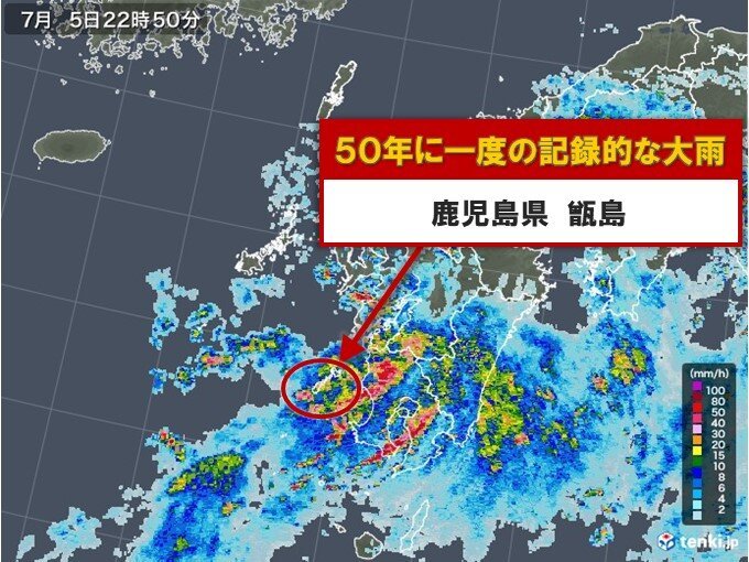 停滞する梅雨前線に向かって暖かく湿った空気が流れ込み、大気の状態が非常に不安定になっています。九州南部では局地的に発達した雨雲がかかり、鹿児島県の甑島(こしきしま)では再び「50年に一度の記録的な大雨」となっている所があります。