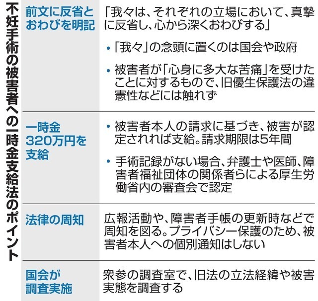 A 1948年から96年まで、「不良(ふりょう)な子孫(しそん)」が生まれるのを防ぐことを目的とした旧優生保護法(きゅうゆうせいほごほう)があったんだ。政府はこの法律をもとに障害のある人たちへの不妊手術を進め、約2万5千人が被害者(ひがいしゃ)となった。今年4月、被害者に320万円を支払う「一時金支給法」が成立した。これまでに、60~80代の女性5人への支給を決めたよ。…… 本文:881文字 この記事の続きをお読みいただくには、朝日新聞デジタルselect on Yahoo!ニュースの購入が必要です。