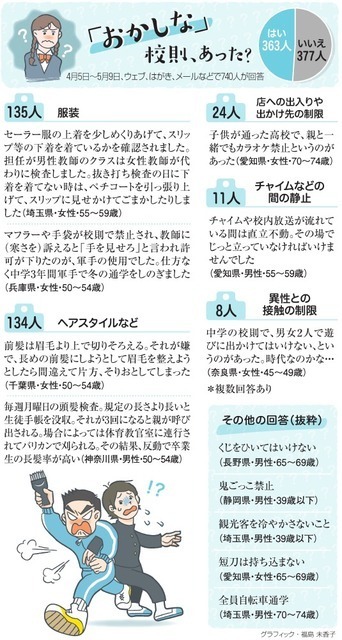 東京都内の看護師の女性(60)は、九州の私立女子高校に入学してまもなく、校内放送で説明された校則が忘れられない。