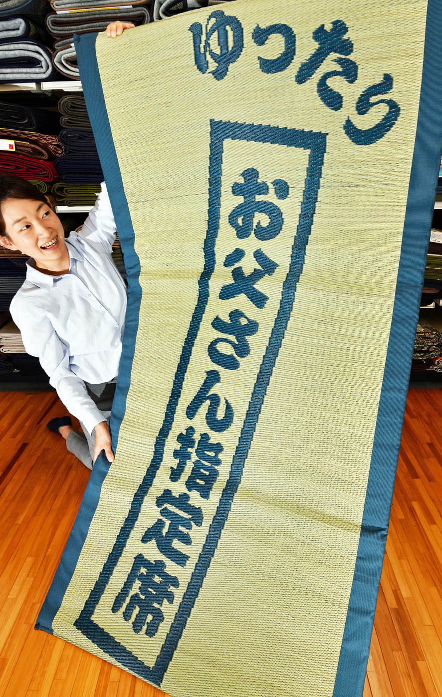 商品名は「もっと親父の場所」。幅88センチ、長さ1・8メートルの敷布団サイズで、熊本県や福岡県産のイ草を織った生地に綿を詰めた。クッション性を持たせ寝心地良く仕上げている。紋織りという技法を用い、大きく「お父さん指定席」の文字を描いている。