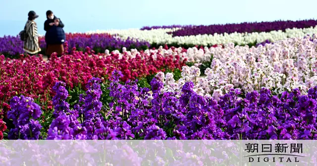 兵庫県淡路市の県立公園「あわじ花さじき」で、ストックの花が見ごろを迎えている。訪れた人たちは、色とりどりの花と一緒に写真を撮るなどして楽しんでいた。