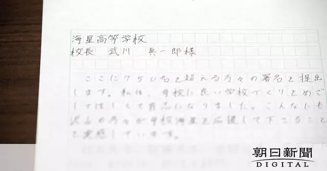 メンバーの在校生が校長に宛てた直筆の手紙も添えて送った。校長らに対し「生徒の命や人権を本気で守ってくれていますか? 日々の小さな間違いも生徒はしっかり見ています」とつづった。25日に記者会見した佐々木さんは「教育機関としての良心に基づき生徒に寄り添うことを期待する」と話した。