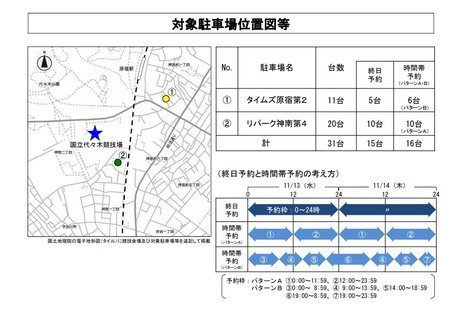今回、国立代々木競技場周辺の時間貸駐車場を、予約専用駐車場に転換し、物流車両を対象に、優先利用案内した場合の予約・利用状況の確認や現地運用方法を検証する。