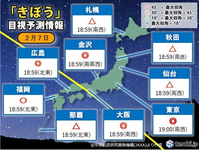 明日(8日)も18時9分頃から18時15分頃にかけて東北から近畿で観測のチャンスがあります。東北から近畿にかけては太平洋側を中心に晴れて、見られる所が多くなりそうです。是非、夜空を見上げてみて下さい!