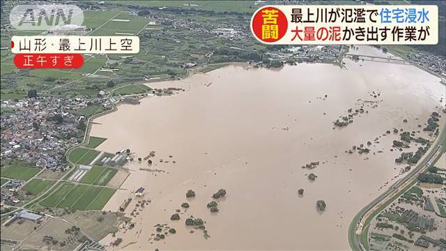 記録的な大雨の影響で最上川が氾濫し、山形県では住宅が浸水する被害が出ています。住民は大量の泥をかき出す作業に追われています。 本来の川がどこをどのように流れていたのか、上空から見ても判別できません。川と、そうではない場所の区別がつかない状態。水が何かを乗り越える際にできるかすかな波。ここが堤防でしょうか。土手の両サイドにポンプ車のホースが渡されているものの、もはやどちらが川か分かりません。雨はすでに上がっています。しかし、水位の上昇は遅れて表れました。橋桁に迫る水面。
