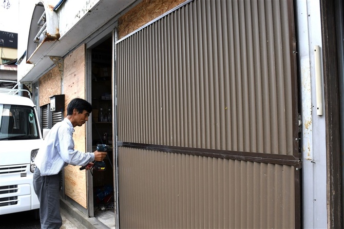7月の豪雨による河川氾濫や大規模浸水で被害を受けた地域でも、対策が進んだ。大分県日田市天瀬町の天ケ瀬温泉街の住民たちは、ほとんどが台風に備えた作業を終えていた。 濁流に流された事務所のガラス部分に雨戸を固定していた自営業安達豊さん(67)は「大雨の次は巨大台風。水害にぴりぴりしている」と疲れた様子。美容室が被災し、仮店舗で営業を始めたばかりの中野須磨子さん(73)は「店の入り口はベニヤ板でできており、倒れてきたらどうしよう」と不安を口にした。