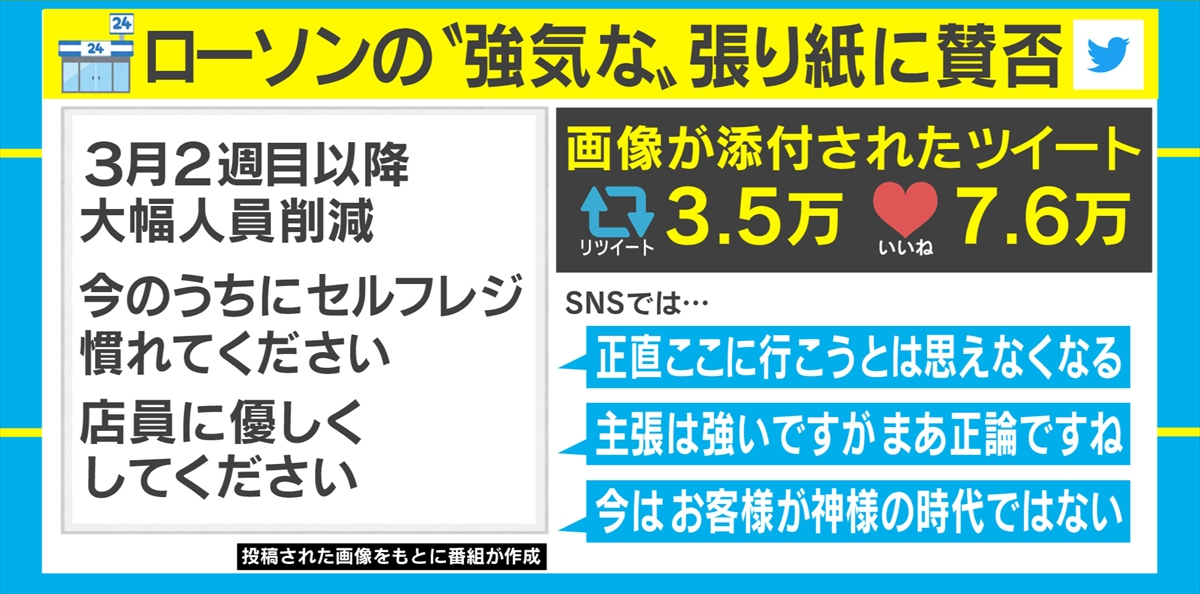 張り紙は「3月2週目以降大幅人員削減 今のうちにセルフレジに慣れてください 店員に優しくしてください」という内容で、写真がTwitterに投稿されるとリツイートは3万5000件、「いいね」が7万6000件集まった。この投稿には「正直ここに行こうと思えなくなる」「主張は強いですが まあ正論ですね」「今はお客様が神様の時代ではない」と賛否の声があがっている。