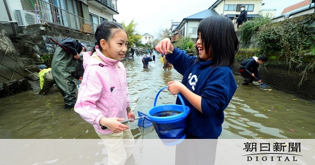 2月下旬、やながわ有明海水族館が開いた「お堀の大調査」。堀の水を抜いて天日干しと清掃をする地域の伝統行事「水落ち」にあわせたイベントで、胴長姿の親子連れらが掘に入り、生き物探しを楽しんだ。