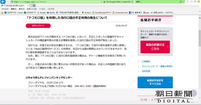 中国銀行(本店・岡山市)は、NTTドコモの電子マネー決済サービス「ドコモ口座」を使った不正な預金引き出しが発生したことを明らかにした。ホームページ上で7日に公表した。4日以降、数件の被害申告があるという。同行の口座番号やキャッシュカードの暗証番号などが漏れたとみられ、経緯を調べる。