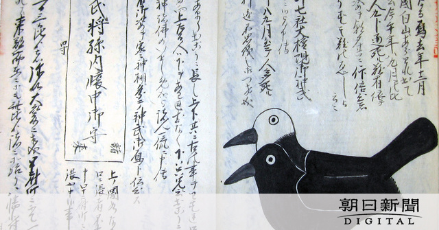 ヨゲンノトリは、旧市川村(現山梨市)の名主の喜左衛門が、1858(安政5)年に記した「暴瀉病流行(ぼうしゃびょうりゅうこう)日記」に描かれた頭が二つある鳥の絵だ。