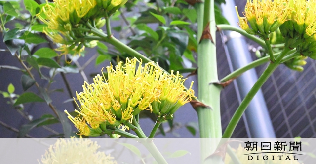 【神奈川】数十年に一度だけ花を咲かせるリュウゼツランが、川崎市中原区新丸子町のビル敷地内に開花した。珍しい黄色い花が道路に顔をのぞかせていて、道行く人の目を楽しませている。