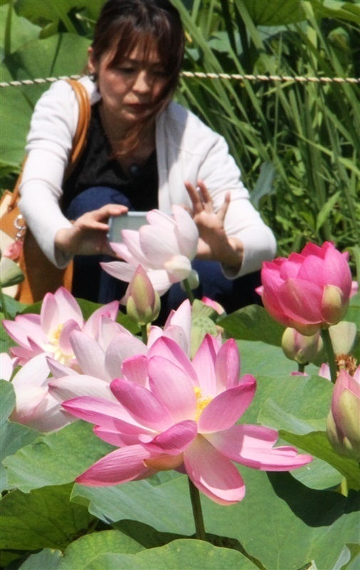古代ハスに起源を持ち、「二千年ハス」と呼ばれる大賀ハスの観賞会が23日、みやき町白壁の千栗土居公園の池であった。町内外から100人を超す見物客が訪れ、ピンク色の濃淡が優美な花をじっくりと見つめたり、カメラを向けたりして楽しんだ。