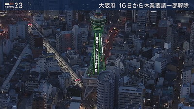大阪モデルが7日連続で達成されたことをうけ14日夜、通天閣と太陽の塔は緑色にライトアップされました。吉村知事は14日夜の対策会議で16日午前0時から商業施設や大学などのほか一定の基準を満たしている劇場や映画館、運動施設などの休業要請を解除することを決めました。