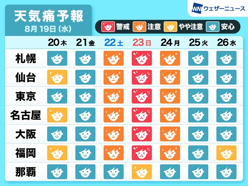 天気や気圧の変化により体調に変化が生じる「天気痛」。 毎日決まった時間に起こる「大気潮汐」と呼ばれる気圧変化の変動が通常より大きくなることに加え、今週末は曇りや雨となる所もあるため、天気痛の影響を受けやすい方は注意や警戒が必要となる予想です。