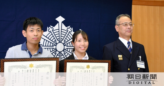 とっさの心肺蘇生法と119番通報で80代男性の命を救ったとして、南但消防本部(兵庫県朝来市)は10日、香美町の看護学生宮脇友梨さん(21)と養父市の田村公貴さん(27)に感謝状を贈った。