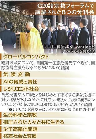 大阪市で行われる20カ国・地域(G20)首脳会議(サミット)を前に、世界各国の宗教指導者らがタイムリーな社会問題を話し合う異色の会議が京都市で開かれた。その名も「G20諸宗教フォーラム2019」。人工知能(AI)や生命科学といった課題に、仏教の僧侶やキリスト教の神父・牧師、イスラム教の聖職者など約140人が危機感を持ち、知恵を出し合ったのだ。世俗の政治を離れた宗教者の視点から政策提言を行い、G20サミットの議論に補助線を引く役割を果たそうとしている。