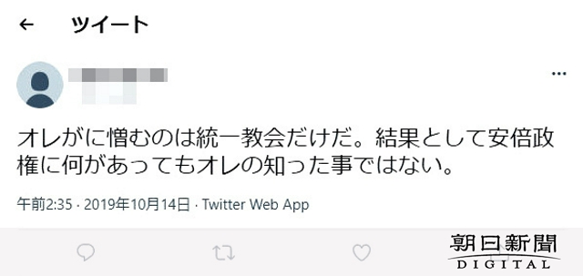 「憎むのは統一教会だけだ。結果として安倍政権に何があってもオレの知った事ではない」(2019年10月14日)