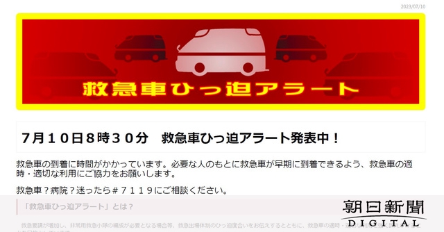 救急車逼迫アラートは、23区内か多摩地区の救急隊の出動率が80%を超えたり、その状態が続いたりすることが予想される時に出される。同庁はウェブサイトやSNSで周知して、救急車の適正な利用を呼びかける。