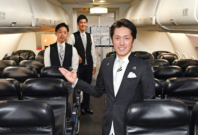 目標の日本らしいおもてなしを求め、10年前に今の職場に移った。同社では183人のCAのうち男性は14人。荷物の積み降ろしなど力仕事は率先して引き受けるが、男女の差は感じていない。各便、CA3人が搭乗する同社のフライト。「三者三様のおもてなしができる。思い出に残る接客を心掛けたい」 (宮下雅太郎)
