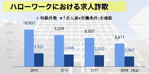 求人票の内容と実際の労働条件が異なる「求人詐欺」。厚労省によると、近年は減少傾向にあるようだ。全国のハローワークにおける2018年度の相談件数は6811件で、前年度から20%ほど減った。