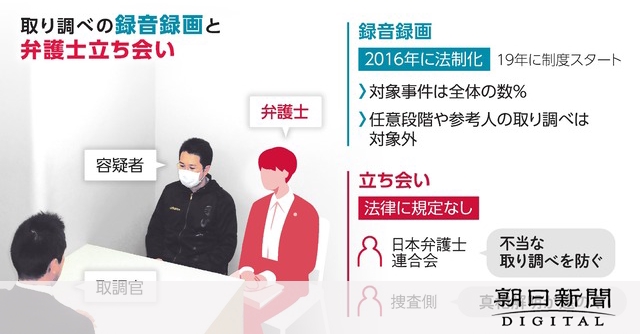 取り調べの弁護士立ち会いは、冤罪事件の続発を受けて11年に始まった国の法制審議会でも議論になった。だがその後の刑事訴訟法の改正では、取り調べの一部の録音録画が優先され、棚上げされた経緯がある。