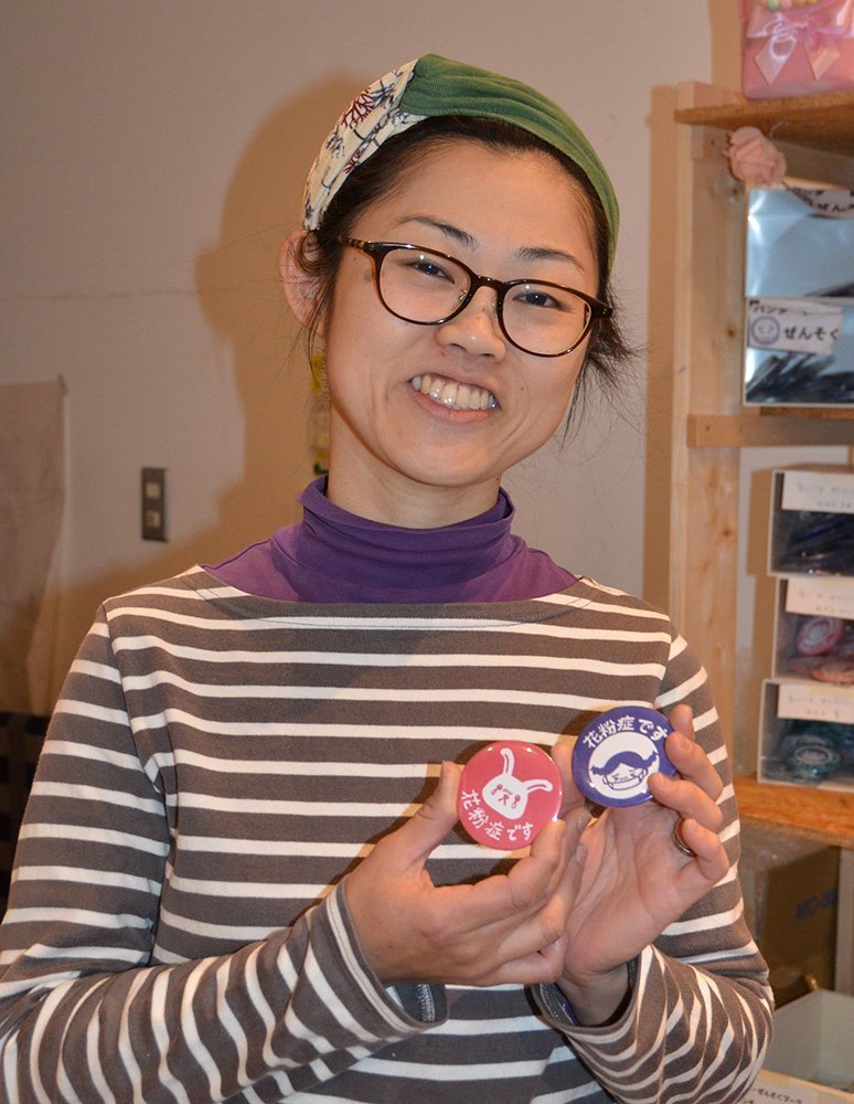 「花粉症マーク缶バッジ」と「ぜんそくマークバッジ」を製造するのは、ハンドメード雑貨店「エピリリ」。店主の牧野美和さん(38)がデザインし、昨年から店頭で販売を始めた。