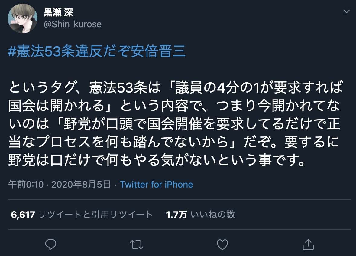 Twitterで拡散されているのは、10万以上のフォロワーを持つ黒瀬深氏のアカウントによる、8月5日の以下のような内容のツイートだ。 6000以上リツイートされ、1万7000以上いいねされるなど、大きく拡散している。 《#憲法53条違反だぞ安倍晋三というタグ、 憲法53条は「議員の4分の1が要求すれば国会は開かれる」という内容で、つまり今開かれてないのは「野党が口頭で国会開催を要求してるだけで正当なプロセスを何も踏んでないから」だぞ。要するに野党は口だけで何もやる気がないという事です。》 そもそも憲法53条とは、内閣の臨時国会の招集を定めた条文。衆議院か参議院、どちらかの総議員の4分の1以上の要求があれば、召集を「決定しなければならない」と定められている。 《内閣は、国会の臨時会の召集を決定することができる。 いづれかの議院の総議員の四分の一以上の要求があれば、内閣は、その召集を決定しなければならない。》 立憲民主党などの野党はこれに基づき、豪雨災害や新型コロナウイルス対応のために臨時国会の召集を要求した。しかし内閣側は招集に応じておらず、野党側は「憲法違反だ」と反発している。