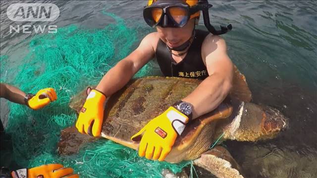 島根県で漂着した網に絡まって身動きが取れなくなっていたウミガメを訓練中の海上保安官が見つけて救助しました。 21日午前10時ごろ、松江市の菅浦港で海上保安庁・美保航空基地所属の機動救難士4人が潜水訓練中に付近の岩場で網に絡まったウミガメを見つけました。ウミガメは甲羅が約1メートル、体重は60キロ程度で、絡まった網をナイフで切ったところ、ウミガメは海に戻っていきました。ただ、首には網が食い込んだ傷痕が残っていたということです。