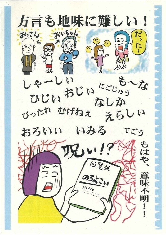 市地域活力創造課によると、地域の特徴を分かりやすく知ってもらおうと2018年に制作。ネタを募集し、移住者らでつくる市民グループ「楽しい暮らしサポーターズ事務局」がイラストを描いた。移住希望者らに配布したり、市のホームページで公開したりして活用している。