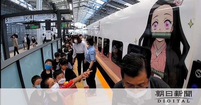 人気アニメ「鬼滅の刃」のキャラクターが描かれたJR九州の特急かもめ(博多―長崎)が29日、運行を始めた。この日の朝、長崎駅には主人公の竈門(かまど)炭治郎(たんじろう)や妹の禰豆子(ねずこ)に扮した保育園児らが出発を見送った。運行は12月下旬まで。