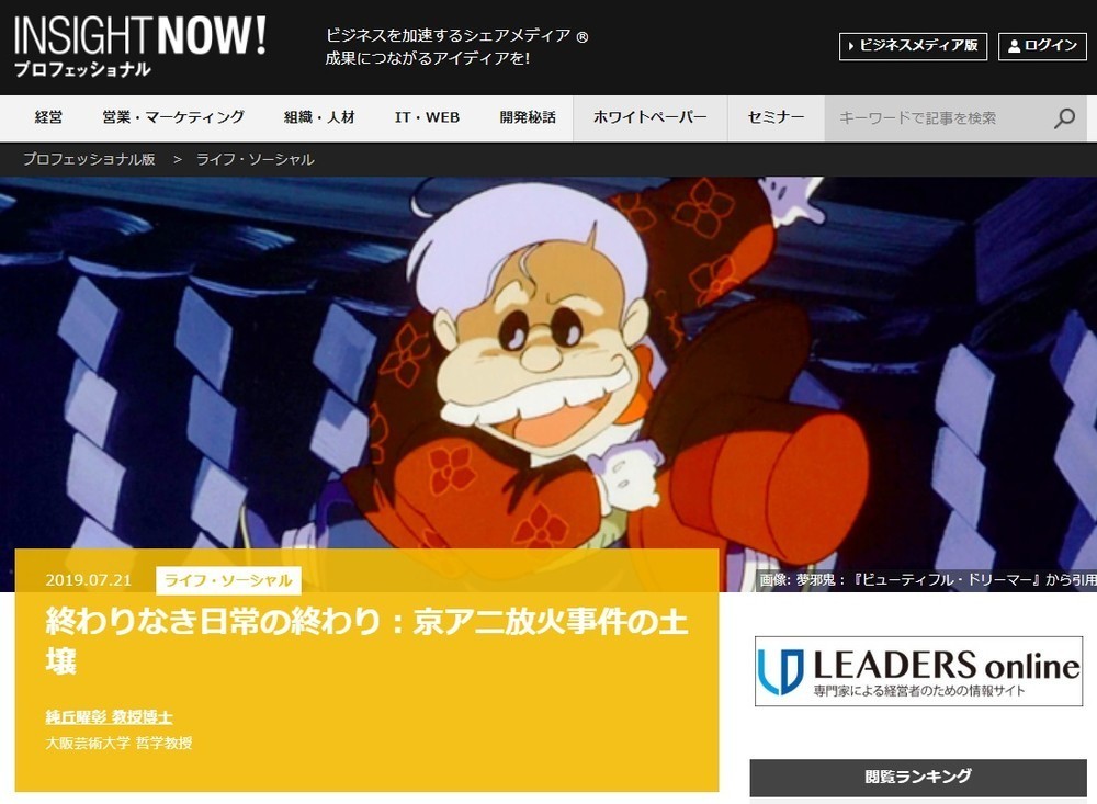 純丘氏をめぐっては、南青山インサイト(東京都港区)が運営するウェブメディア「インサイトナウ」へ21日に寄稿したコラムが「炎上」状態にある。「終わりなき日常の終わり:京アニ放火事件の土壌」のタイトルで長さは約3000字。特に問題となったのは最終盤のこの段落だ。